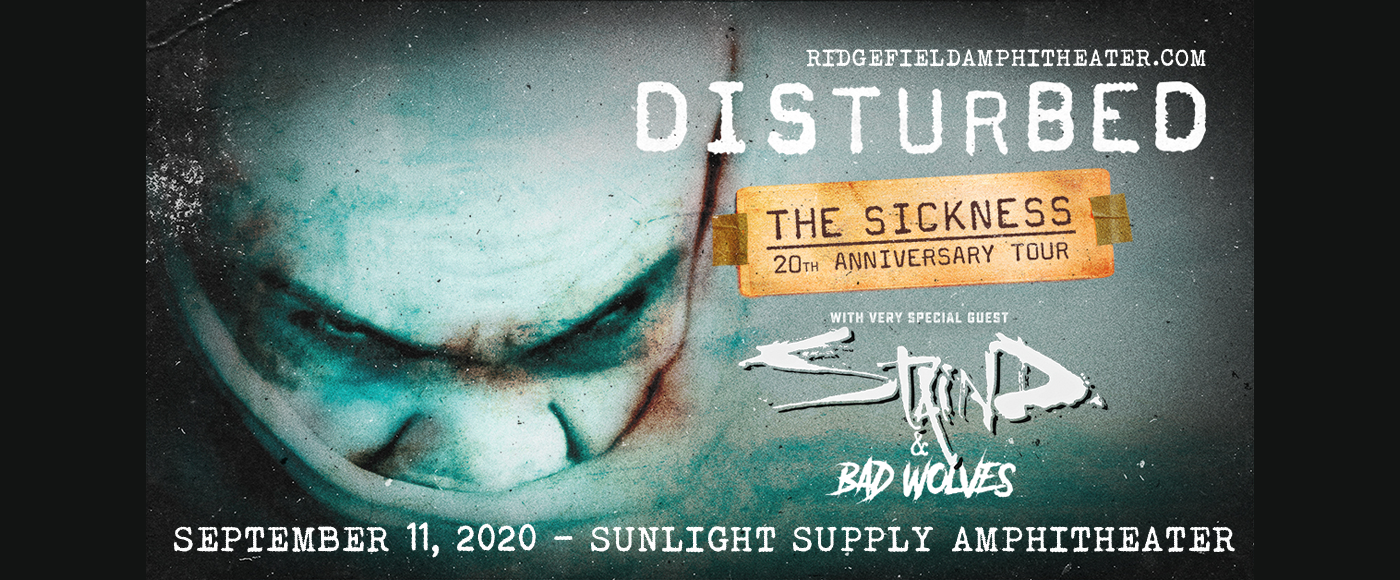 It's been two whole decades since heavy metallers Disturbed released their smash hit debut album, The Sickness! The five-times platinum record launched the band into the metal stratosphere with huge tracks like "Down With the Sickness" and "Stupify," gaining them loyal fans the world over! Now, to celebrate the 20th anniversary, the band is heading out on a massive tour that comes to Sunlight Supply Amphitheater on Friday 11th September 2020! They'll be joined for a rare appearance by Aaron Lewis-fronted alt-metal band Staind, and heavy metal supergroup Bad Wolves, in support!